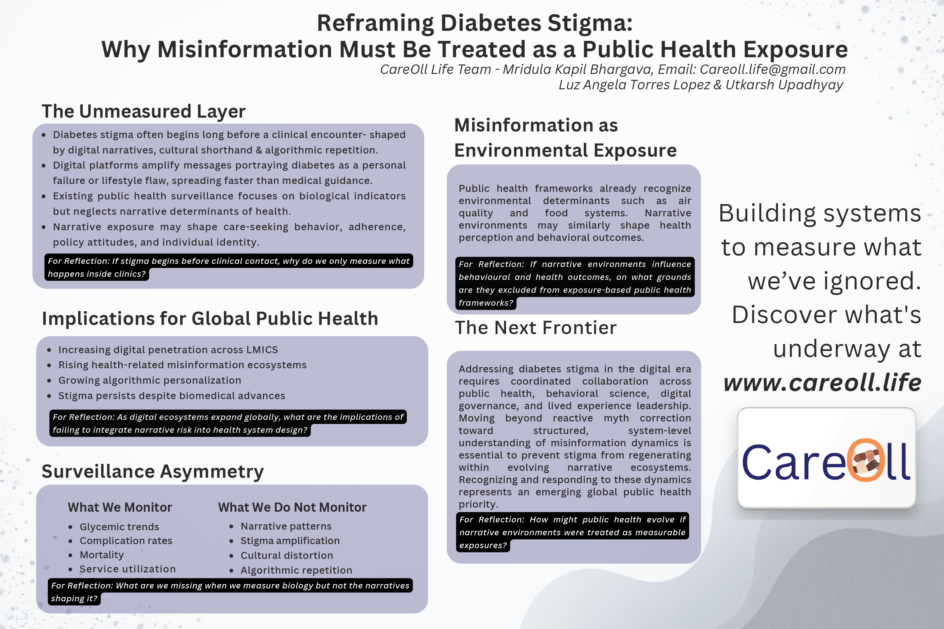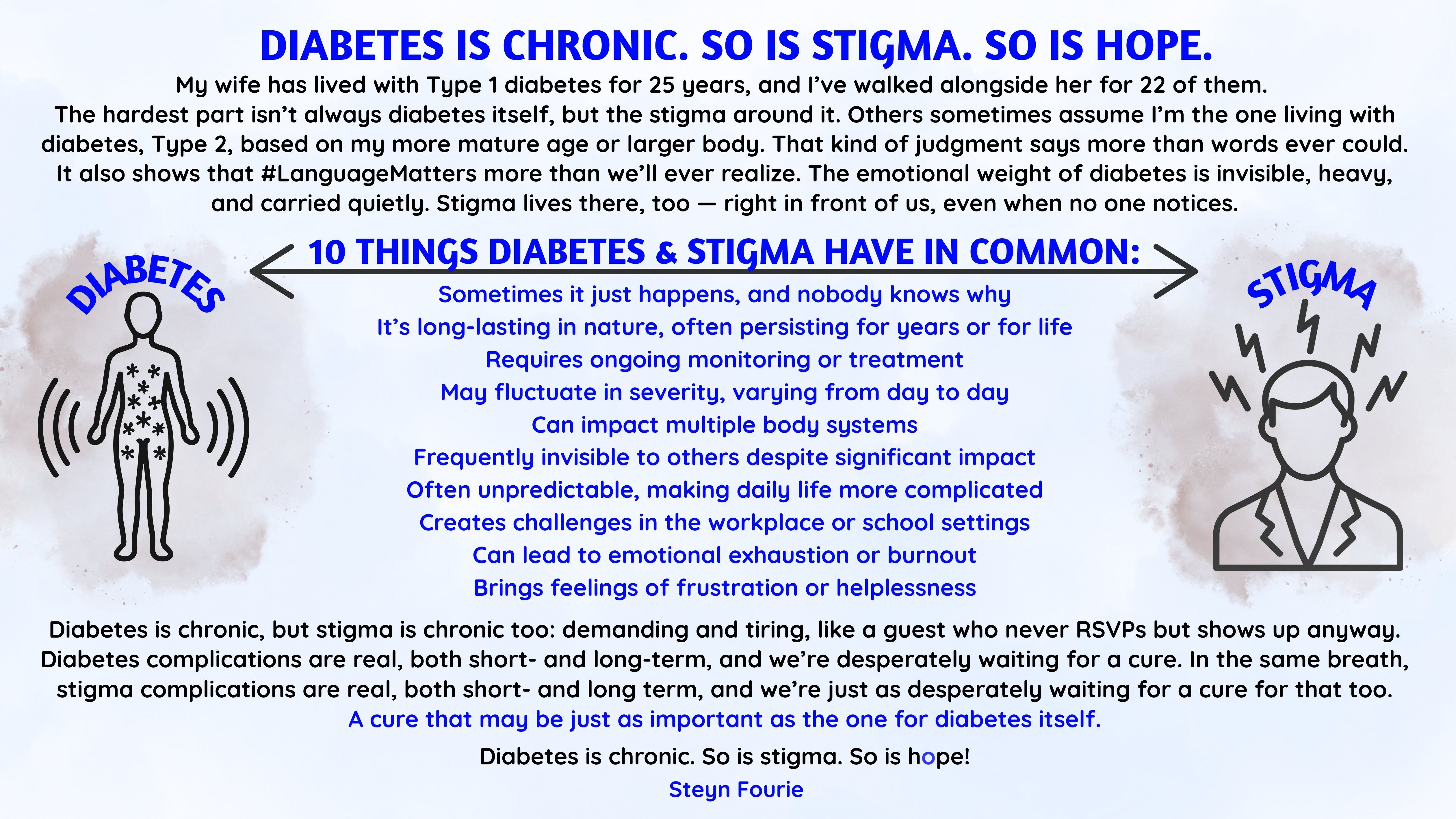 This abstract offers lived-experience insight into the emotional, cultural, and structural dimensions of diabetes stigma, emphasizing the urgent need for global action to create environments where individuals with chronic conditions are understood, supported, and valued.