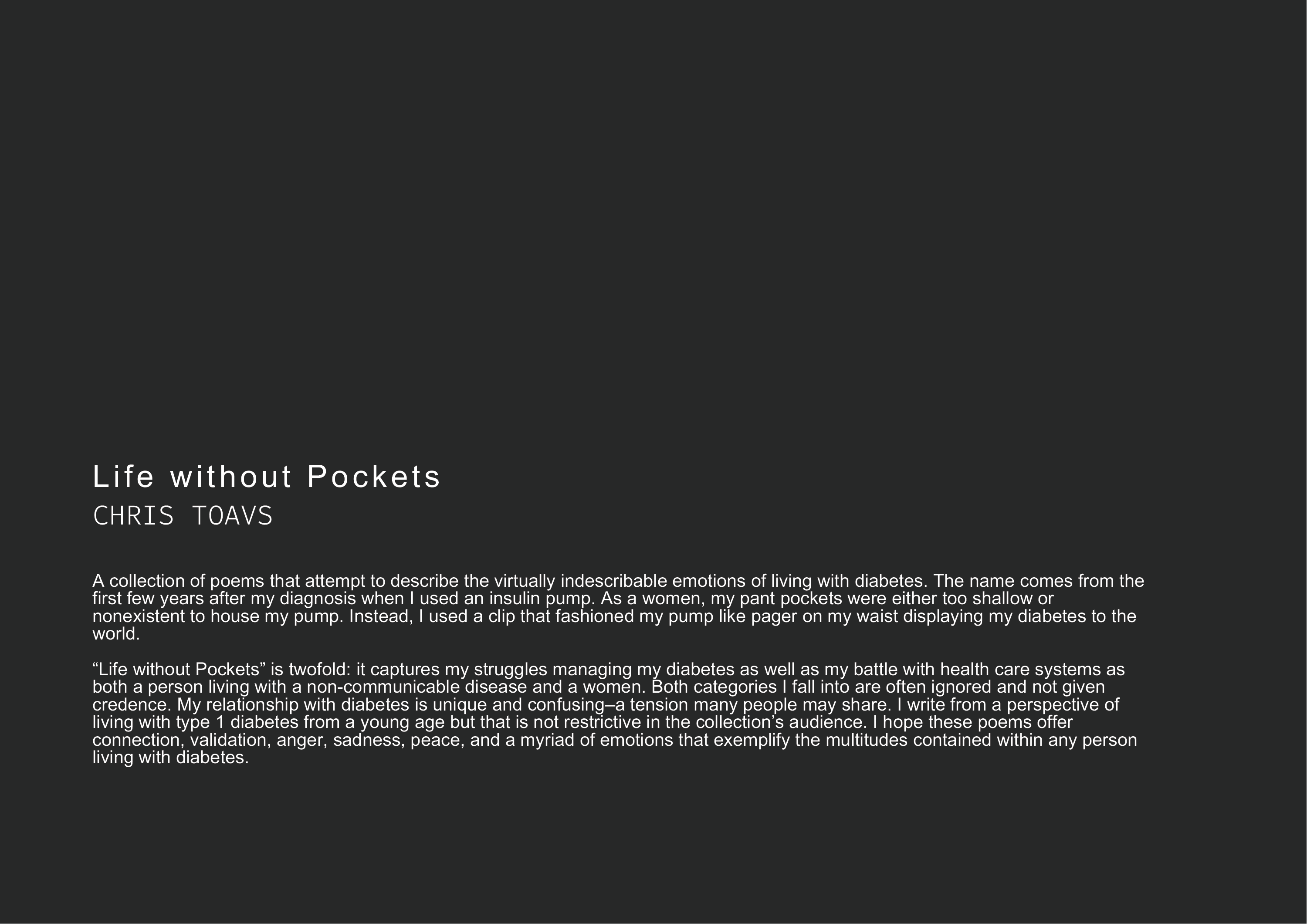 The title of this collection of poems bears from my time using an insulin pump. Often my clothes/pants did not have pockets to hold my pump and was thus on display via a clip for the world to see. This reference, though, contains multiple facets drawing on my identity as a woman in a patriarchal world, a person living with diabetes in an ableist world, and a combination of the two as a woman living with diabetes in a biased healthcare system.