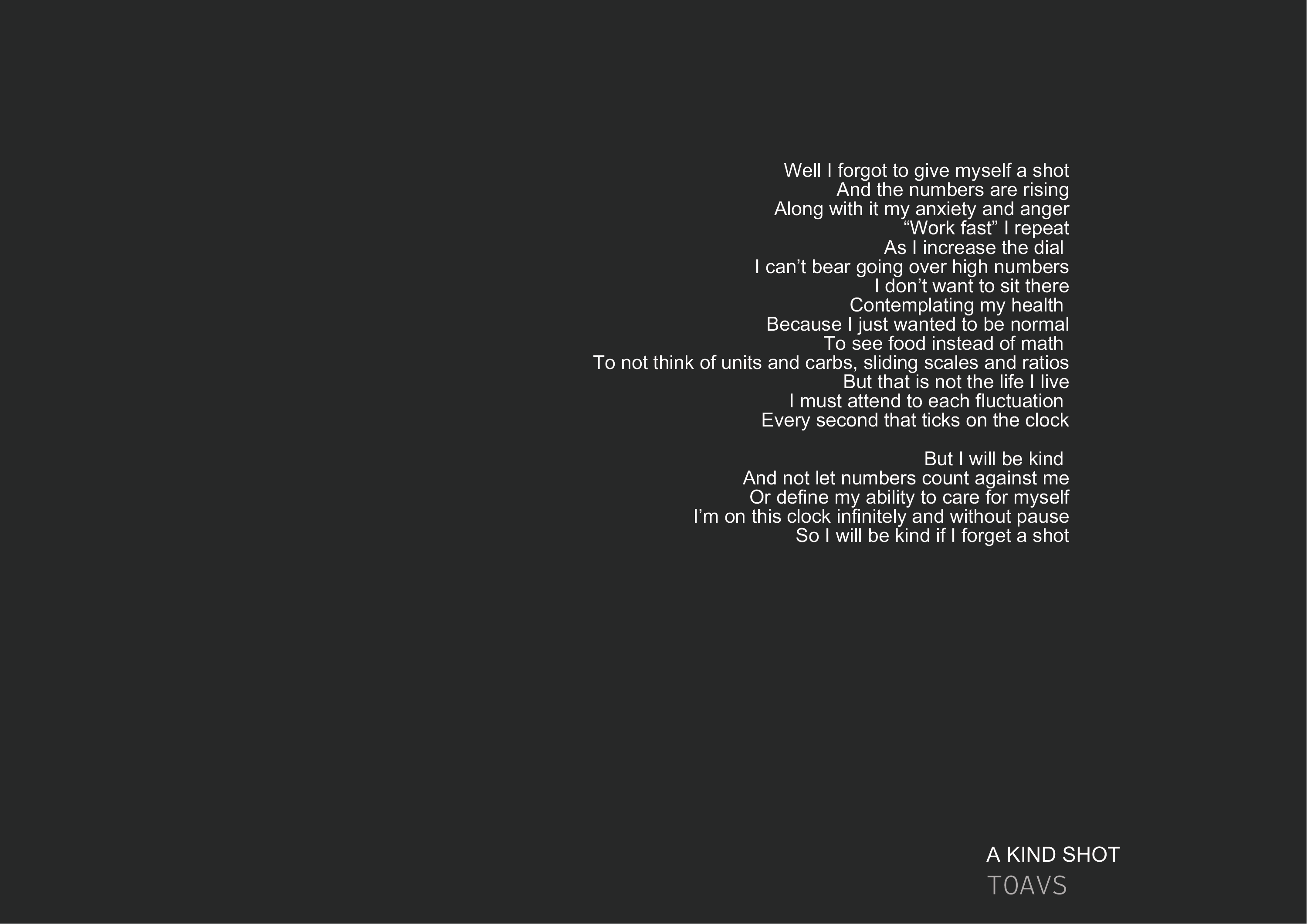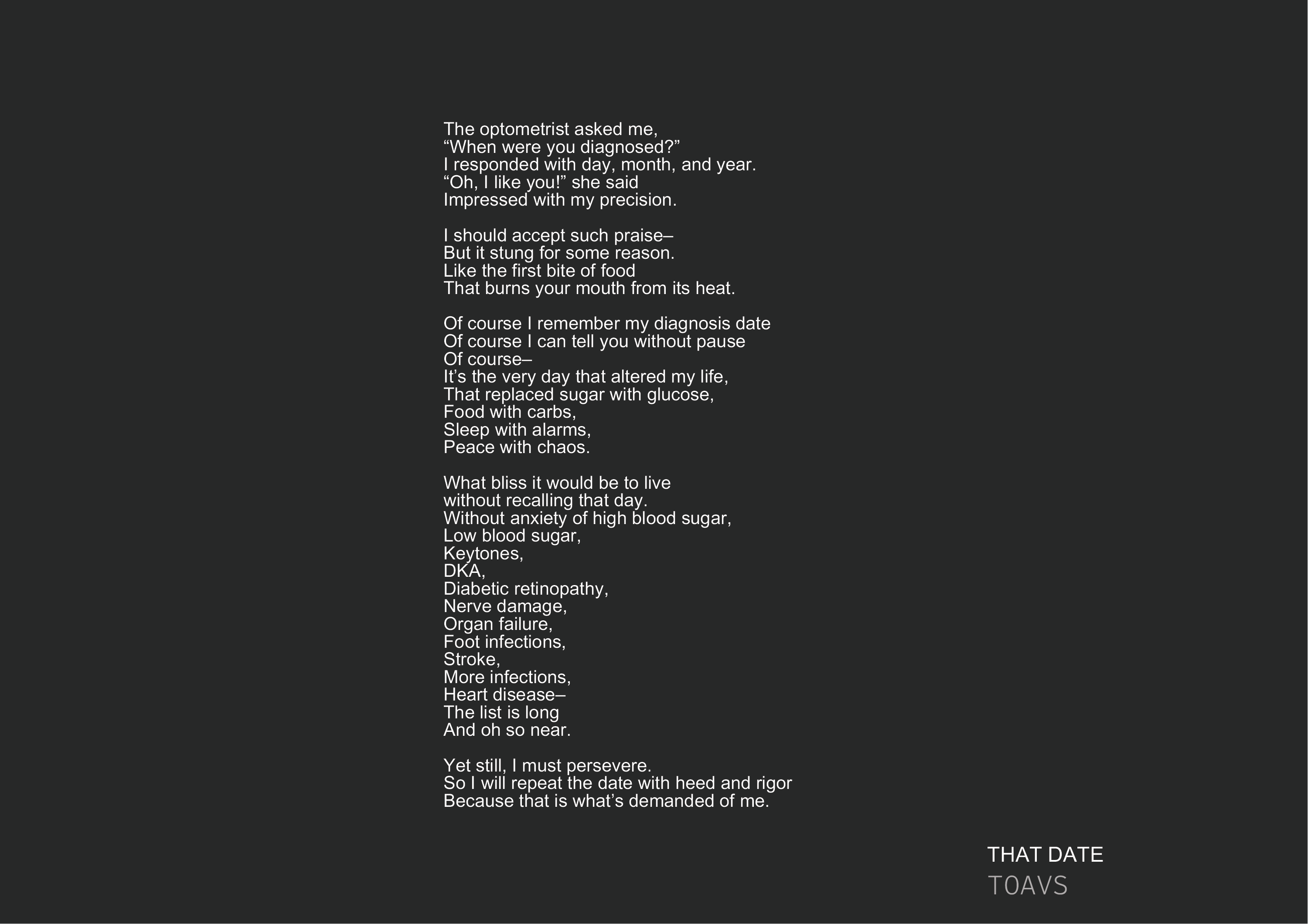 The work is entirely grounded in my own lived experience with Type 1 Diabetes, reflecting authentic emotions, challenges, and perspectives.