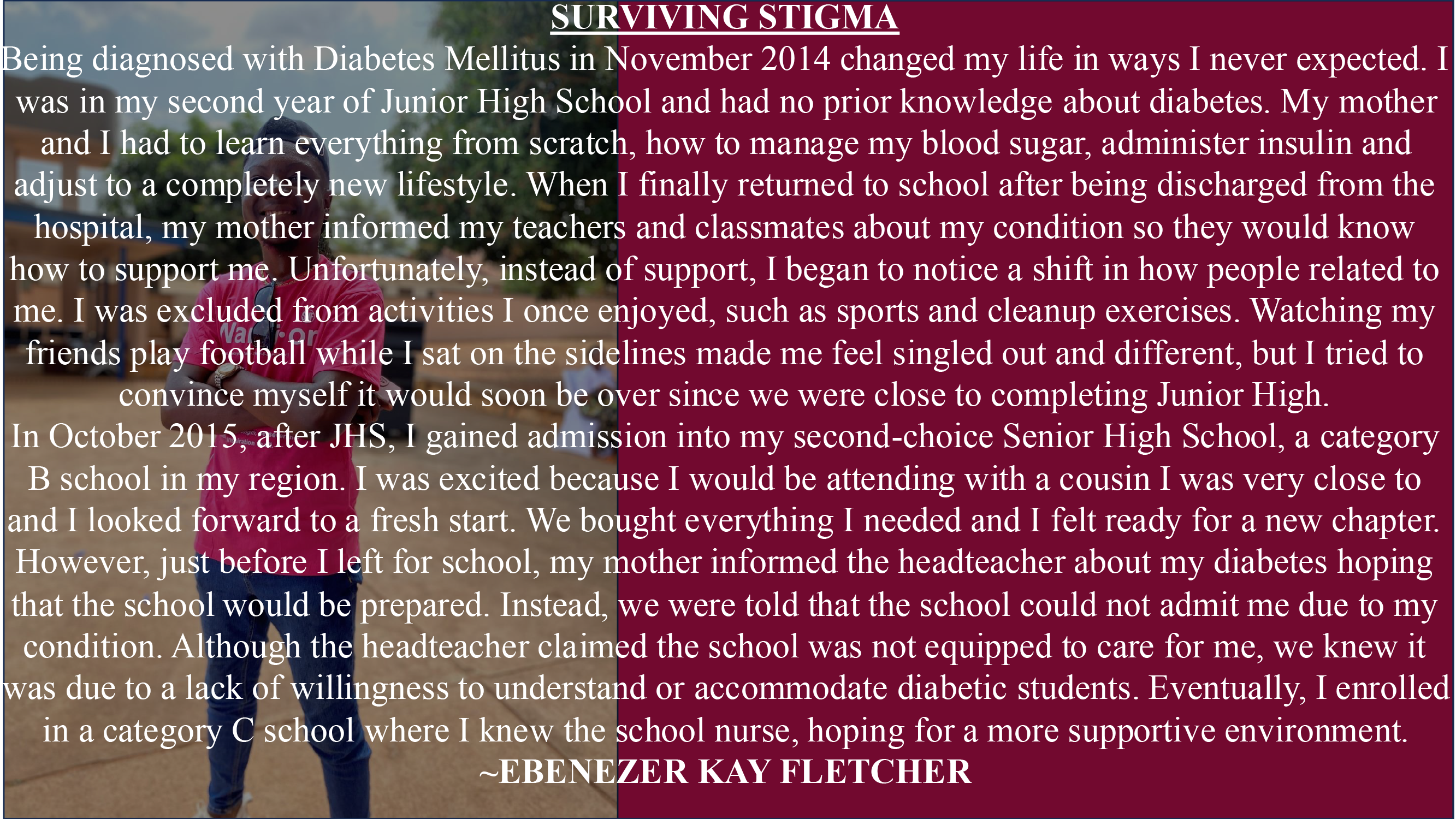 Being diagnosed with Diabetes Mellitus in November 2014 changed my life in ways I never expected. I was in my second year of Junior High School and had no prior knowledge about diabetes. My mother and I had to learn everything from scratch, how to manage my blood sugar, administer insulin and adjust to a completely new lifestyle. When I finally returned to school after being discharged from the hospital, my mother informed my teachers and classmates about my condition so they would know how to support me. Unfortunately, instead of support, I began to notice a shift in how people related to me. I was excluded from activities I once enjoyed, such as sports and cleanup exercises. Watching my friends play football while I sat on the sidelines made me feel singled out and different, but I tried to convince myself it would soon be over since we were close to completing Junior High.