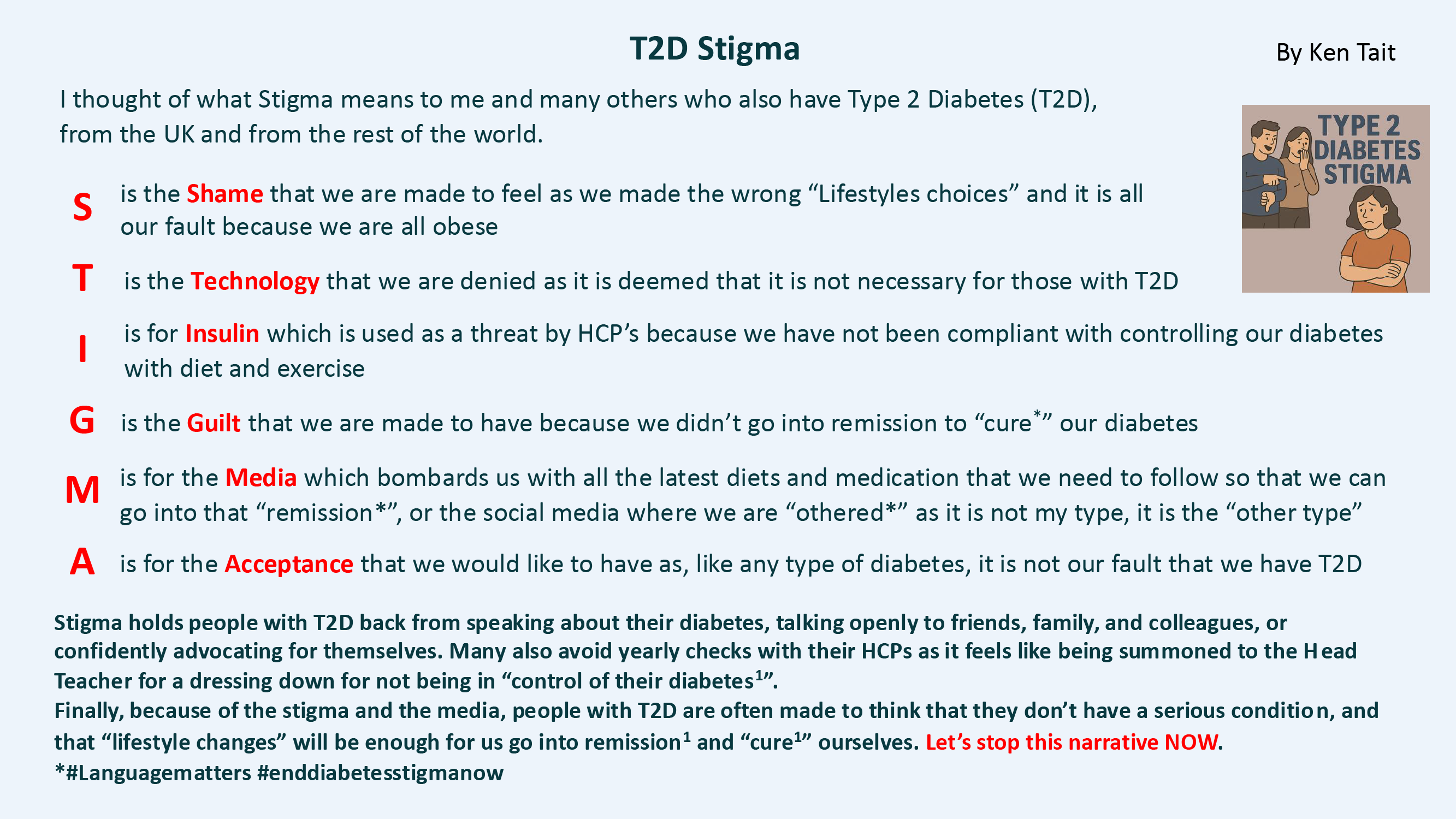 Thinking about what stigma means to people living with type 2 diabetes and using the anagram STIGMA as a method of conveying this.
