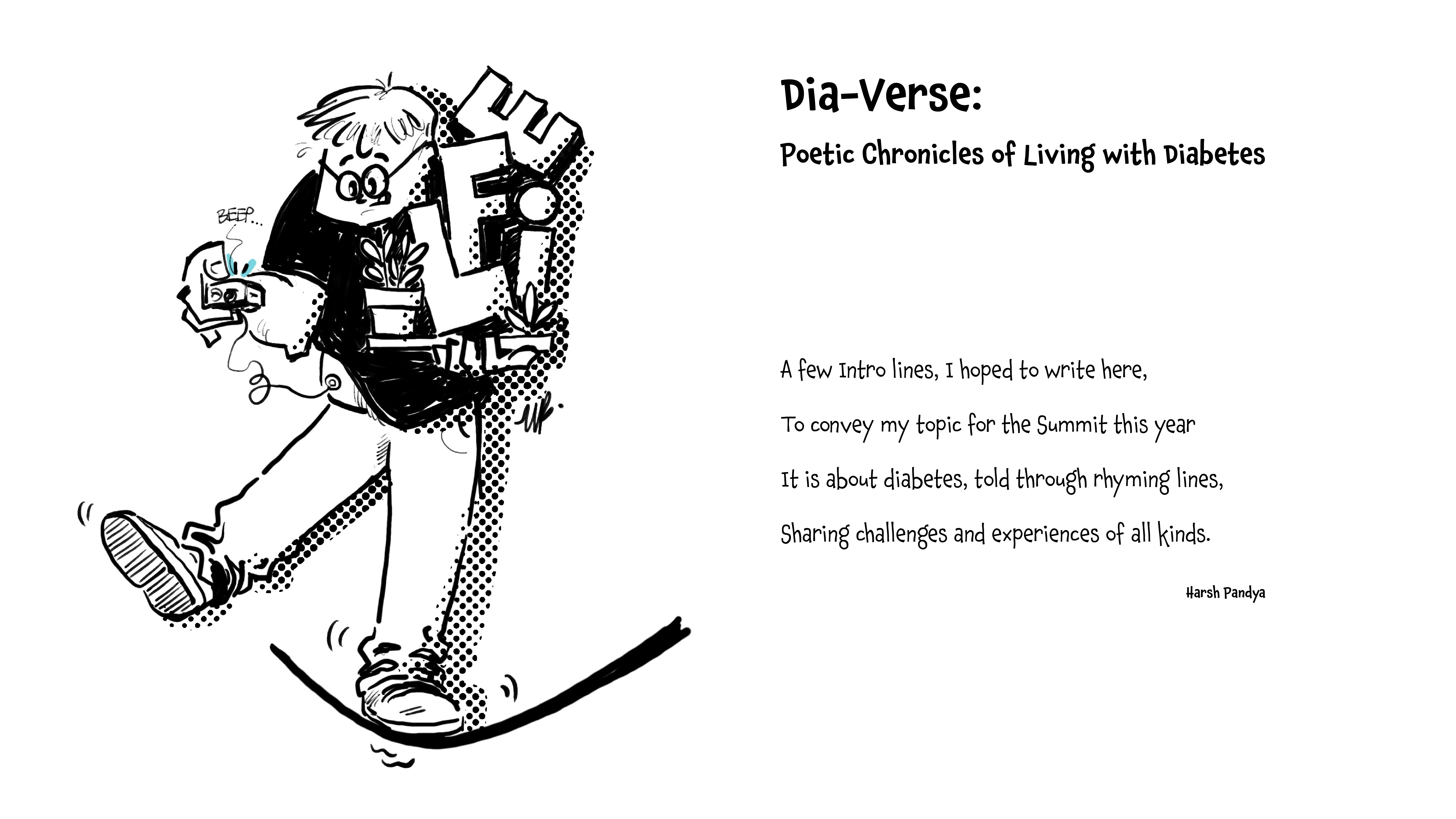 Dia-Verse is a playful exploration of expressing diabetes experiences through the use of rhymes and poems. As the author and also a person living with Type 1 Diabetes, I bring authentic observations and experiences to these verses, addressing multiple dimensions of the diabetes journey. From navigating festivals and sports to cultivating self-awareness, understanding fundamentals, and adapting to new situations. Each poem serves as a window into the daily realities, triumphs, and challenges that often remain hidden behind clinical terminology and medical statistics.