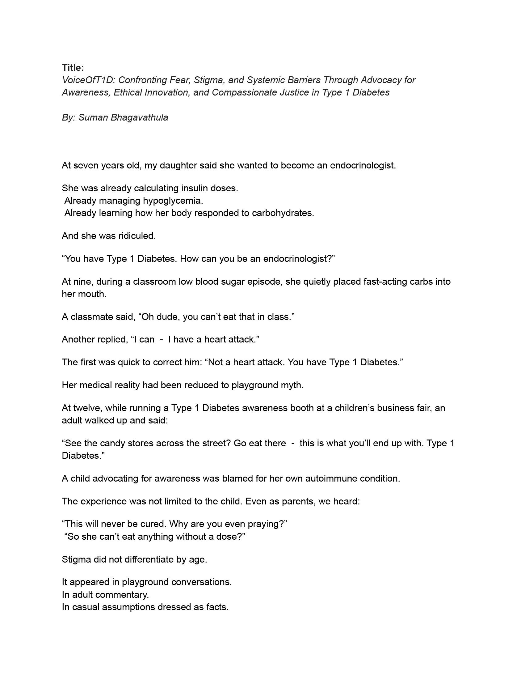 In response to these challenges, together with my child, family, and community allies, I founded VoiceOfT1D, an initiative dedicated to confronting diabetes stigma, promoting accurate understanding of T1D, advocating for equitable access to technology, and supporting families across India, United States and the world.