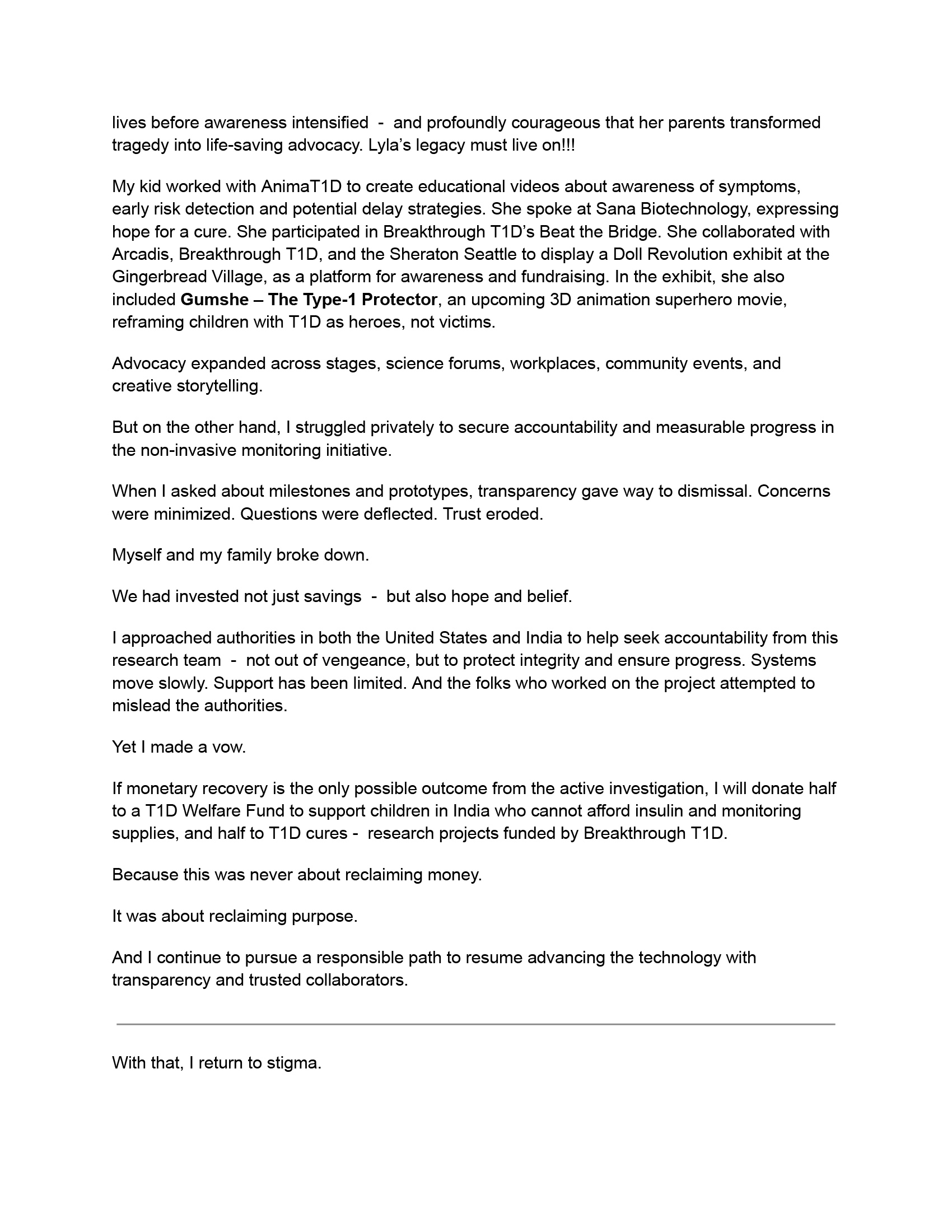 I call for compassionate justice, so that families and patient advocates can focus on advancing much-needed diabetes technologies rather than expending energy navigating systemic barriers or misinformation. By fostering ethical collaboration, transparency, and accountability, we can ensure patient-centered solutions reach those who need them most while simultaneously reducing stigma and empowering the T1D community.